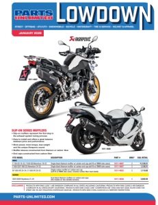 DISCLAIMER: PRODUCTS WITH EMIS CODE 1 ARE EMISSION COMPLIANT IN ALL STATES, INCLUDING CALIFORNIA. PRODUCTS WITH EMIS CODES 2 ARE EMISSION COMPLIANT IN ALL STATES EXCEPT CALIFORNIA. PRODUCTS WITH EMIS CODE 3 ARE “COMPETITION USE” ONLY,AND NOT LEGAL IN ANY STATE FOR STREET USE ON ANY POLLUTION-CONTROLLED VEHICLES. PRODUCTS WITH EMIS CODE 4 HAVE NO U.S.TERRITORY RESTRICTIONS. STREET • OFFROAD • ATV/UTV • SNOWMOBILE • BICYCLE • WATERCRAFT • TIRE & SERVICE • HELMET & APPAREL JANUARY 2026 • OFFROAD • ATV/UTV • SNOWMOBILE • BICYCLE • WATERCRAFT • TIRE & SERVICE • HELMET & APPAREL PARTS-UNLIMITED.COM FITS MODEL DESCRIPTION PART # EMIS* SUG. RETAIL BMW F 750 GS 18-23, F 850 GS/Adventure 18-23 Single black titanium muffler w/ carbon end cap (will fit w/ BMW side cases) 1811-4887 3 $1,128.31 F 800 GS/F 900 GS Adventure 24-25 Single black titanium muffler w/ carbon end cap (will fit w/ BMW side cases) 1811-4887 3 1,128.31 M 1000 XR 20-24, S 1000 XR 20-25 Single carbon muffler w/ carbon end cap (will fit w/ BMW side cases; includes carbon fiber heat shield) 1811-4852 3 1,110.08 SUZUKI GSX1300R Hayabusa 21-25 Dual black titanium mufflers w/ carbon end caps (fits models w/ two lambda sensors) 1811-4838 3 2,929.39 SLIP-ON SERIES MUFFLERS • Slip-on mufflers represent the first step in the exhaust system tuning process • Easy to install and offers a great balance between price and performance • More power, more torque, less weight and the unique Akrapovic sound • Muffler sleeves constructed from titanium or carbon fiber • End caps constructed from carbon fiber 1811-4887 1811-4838