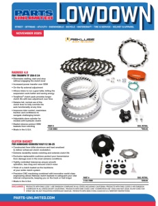 DISCLAIMER: PRODUCTS WITH EMIS CODE 1 ARE EMISSION COMPLIANT IN ALL STATES, INCLUDING CALIFORNIA. PRODUCTS WITH EMIS CODES 2 ARE EMISSION COMPLIANT IN ALL STATES EXCEPT CALIFORNIA. PRODUCTS WITH EMIS CODE 3 ARE “COMPETITION USE” ONLY,AND NOT LEGAL IN ANY STATE FOR STREET USE ON ANY POLLUTION-CONTROLLED VEHICLES. PRODUCTS WITH EMIS CODE 4 HAVE NO U.S.TERRITORY RESTRICTIONS. STREET • OFFROAD • ATV/UTV • SNOWMOBILE • BICYCLE • WATERCRAFT • TIRE & SERVICE • HELMET & APPAREL NOVEMBER 2025 • OFFROAD • ATV/UTV • SNOWMOBILE • BICYCLE • WATERCRAFT • TIRE & SERVICE • HELMET & APPAREL PARTS-UNLIMITED.COM PART # SUG. RETAIL 1130-0893 $999.00 RADIUSX 4.0 FOR TRIUMPH TF 250-X 24 • Eliminates stalling; start and stop without engaging the clutch lever • Increased power transfer over OEM • On-the-fly external adjustment • Allows riders to run a gear taller, letting the suspension work better and saving energy • TorqDrive® clutch pack provides longer clutch life with less adjustment over time • Retains full, normal use of the clutch lever to fully override the auto functionality at any time • Improves rider control, maximizes traction and confidence to navigate challenging terrain • Adjustable slave cylinder for models with hydraulic clutch • Basket sleeves protect OEM baskets from notching • Made in the U.S.A. PART # SUG. RETAIL 1132-1989 $299.00 CLUTCH BASKET FOR KAWASAKI KX80/85/100/112 98-25 • Constructed from billet aluminum and hard anodized to deliver enhanced clutch modulation • Extreme durability resists notching and extends clutch life • Exclusive replaceable cushions protect your transmission from damage even in the most extreme conditions • Tightly controlled tolerances ensure smooth operation, less drag and reduced clutch noise • Think of a clutch basket as the backbone of your entire clutch system • Precision CNC machining combined with innovative world-class engineering allows Rekluse clutch baskets to safeguard your vital internal components, keeping you on the track or trail longer • Made in the U.S.A.