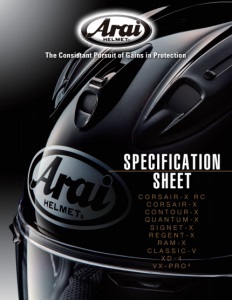 www.AraiAmericas.com © Arai Helmet, Inc. 2023, Printed 01/23 in USA. Specifications subject to change without notice. *HCM (Head Circumference Measurement) should be a starting point only in determining your helmet size. Determining the best possible fit should be from actual test fittings of Arai´s various interior fit packages. Changes and updates can affect the standard pad thickness supplied with your helmet. INTERIOR LINING THICKNESSES CHEEK PAD THICKNESSES OPTIONAL STANDARD / size Lining Code XS I HCM(cm) (53-54) S II (55-56) M III III (57-58) L IV (59-60) XL V (61-62) XXL (63-64) size Lining Code XS I HCM(cm) (53-54) S II (55-56) M III III (57-58) L IV (59-60) XL V (61-62) XXL (63-64) CORSAIR-X RC 12 mm 10 mm 7 mm 5 mm CORSAIR-X 12 mm 10 mm 7 mm 5 mm CONTOUR-X/REGENT-X 12 mm 10 mm 7 mm 5 mm RAM-X QUANTUM-X/SIGNET-X 12 mm 10 mm 7 mm 5 mm XD-4 12 mm 10 mm 7 mm 5 mm VX-PRO4 12 mm 10 mm 7 mm 5 mm size XS HCM(cm) (53-54) S (55-56) M (57-58) L (59-60) XL (61-62) XXL (63-64) CORSAIR-X RC CORSAIR-X CONTOUR-X/REGENT-X QUANTUM-X/SIGNET-X Thicker Thinner 30 - 30 25 20 - 20 - 20 15 12 - 25 - 25 20 15 - Standard (mm) 30 30 30 25 25 20 Thicker 20 20 20 15 15 - Thinner 25 25 25 20 20 15 Standard (mm) 30 30 30 25 25 20 Thicker 20 20 20 15 15 - Thinner 25 25 25 20 20 15 Standard (mm) RAM-X VX-PRO4 30 30 30 25 30 25 Thicker 20 20 20 15 20 15 Thinner 25 25 25 20 25 20 Standard (mm) XD-4 25 25 25 20 20 15 Thicker 15 15 15 12 12 - Thinner 20 20 20 15 15 12 Standard (mm) 30 30 35 30 30 30 Thicker 20 20 25 20 20 20 Thinner 25 25 30 25 25 25 Standard (mm) CLASSIC-V 30 30 30 25 25 20 Thicker 20 20 20 15 15 12 Thinner 25 25 25 20 20 15 Standard (mm) size XS HCM(cm) (53-54) S (55-56) M (57-58) L (59-60) XL (61-62) XXL (63-64)